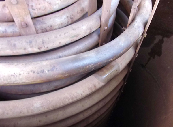 蒸發(fā)器循環(huán)冷卻水中含有大量的鹽類物質、腐蝕產物和各種微生物,由于未對其進行水處理,蒸發(fā)器運行一段時間后水側會結有大量的鈣鎂碳酸鹽垢及藻類、微生物淤泥、粘泥等,這些污垢牢固附著于銅管內表面,導致傳熱惡化、循環(huán)壓力上升、機組真空度降低,影響機組的運行效率,造成較大的經濟損失。